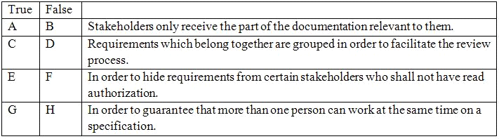 Listed below you will find four reasons why different views of individual components of the requirements are used instead of a single view displaying all the requirements and attributes. Which of the following reasons are true and which are false? (2 Points)