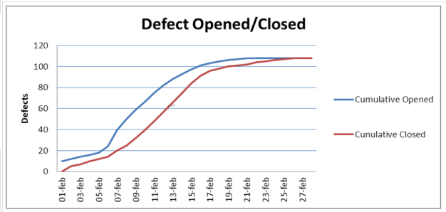 The following chart plots the cumulative number of defects opened against the cumulative number of defects closed during system testing of a software product.