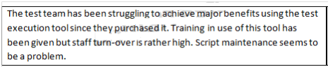 ''The test team has been struggling to achieve major benefits using the test execution tool sine they purchased it. Training in use of this tool has been given bt staff turn-over is rather high. Script maintenance seems to be a problem.