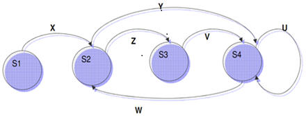 For test case (i) X-Z-V-W, the corresponding state transitions are S1 (X) S2, S2 (Z) S3, S3 (V) S4, and S4 (W) S2. Therefore, the sequence of state transitions is S1 -- S2 -- S3 -- S4 -- S2.