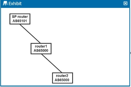 The exhibit shows a BGP peering scenario between three routers: router1 and router2 are part of the same AS (AS65000), while the SP router is in a different AS (AS65101). This indicates an EBGP (External BGP) peering between the SP router and router1, and IBGP between router1 and router2.