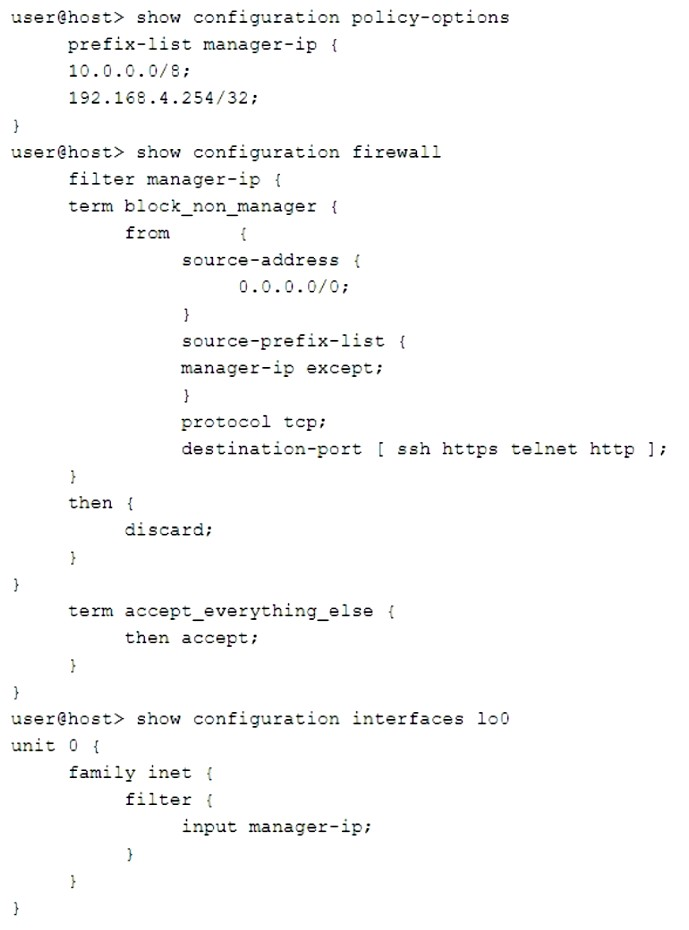 The device manager can access the device from 10.253.1.2: The firewall filter applied on lo0 has a term that matches any packet with a source address of 10.253.1.2 and accepts it. This allows the device manager to access the device from this IP address using protocols such as SSH, Telnet, HTTP, or HTTPS.