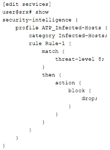 The exhibit shows a configuration snippet for security intelligence on an SRX Series device. Security intelligence is a feature that allows you to block or monitor traffic from malicious sources based on threat intelligence feeds from Juniper ATP Cloud or other providers. The configuration defines a profile for ATP Infected-Hosts, which is a feed that contains IP addresses of hosts that are infected with malware and communicate with command-and-control servers. The configuration also defines a rule for threat level 8, which is a parameter that indicates the severity of the threat. Based on this configuration, the SRX Series device will do the following: