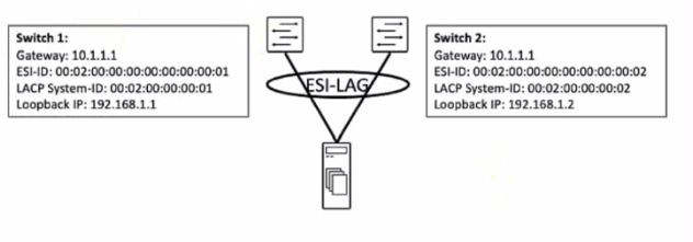 The ESI ID on both devices must be the same. This ensures that the EVPN control plane can advertise the ESI-LAG as a single Ethernet segment and synchronize the MAC and IP addresses of the server across the devices.