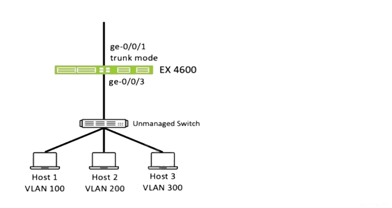 Your network has an unmanaged switch between the hosts and your EX Series switch. After the traffic enters the EX Series switch, each host must be on a separate VLAN.