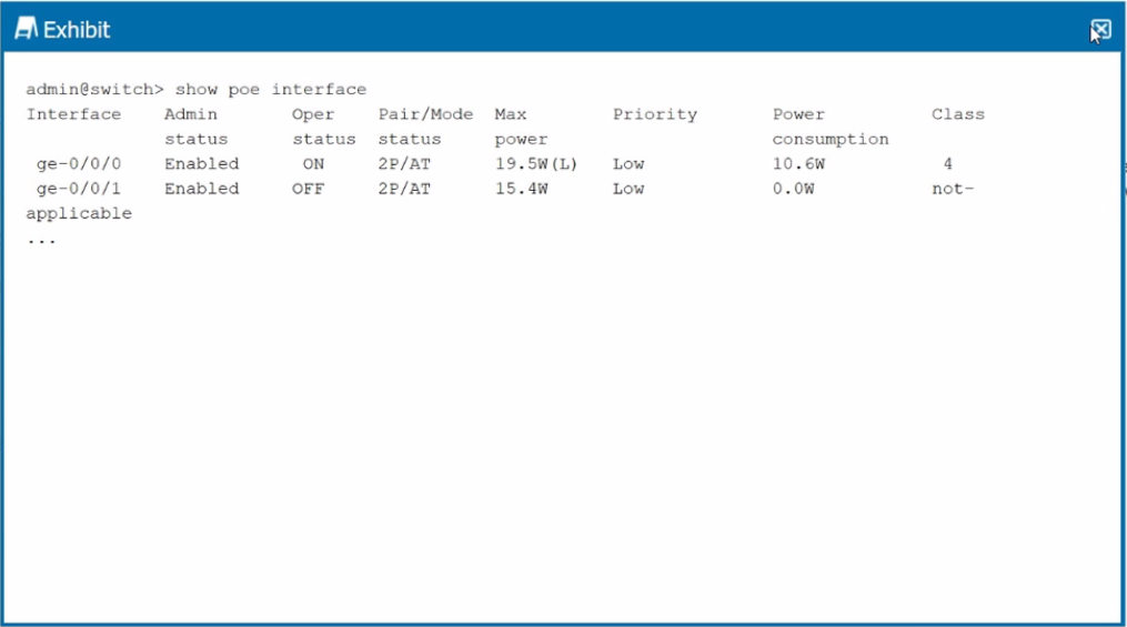 You are deploying a new campus switching environment using various EX Series switch models. The devices attached to one of the new EX Senes switches include IP phones, loT devices, and wireless access points (APs) requiring power over Ethernet (PoE) with varying power requirements. A sample output from one of these switches is shown in the exhibit.