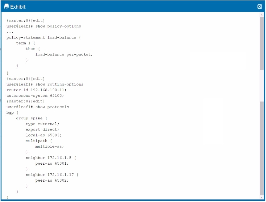 You are troubleshooting an IP fabric (or your data center. You notice that your traffic is not being load balanced to your spine devices from your leaf devices. Referring to the configuration shown in the exhibit, what must be configured to solve this issue?