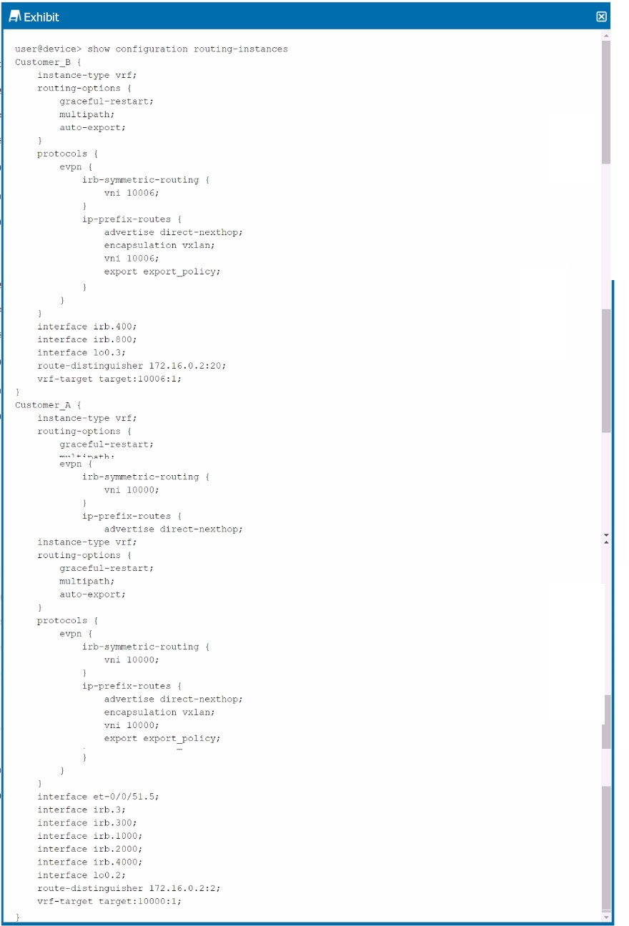 The exhibit shows configurations for two VRFs (Customer_A and Customer_B) with specific VLANs and VNIs assigned. Each VRF has interfaces (IRBs) associated with particular VLANs.