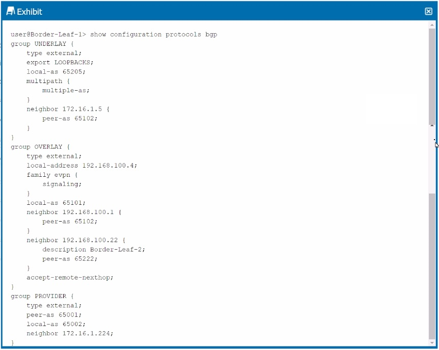 The exhibit shows a BGP configuration on a Border-Leaf device. The BGP group UNDERLAY is used for the underlay network, OVERLAY for EVPN signaling, and PROVIDER for connecting to the provider network.