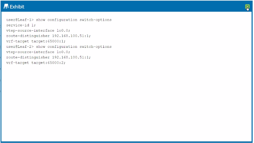 C . Configure the set switch-options vrf-target target:65000:1 parameter on Leaf-2: This aligns the VRF targets between the two leaf devices, ensuring they can correctly import and export routes.