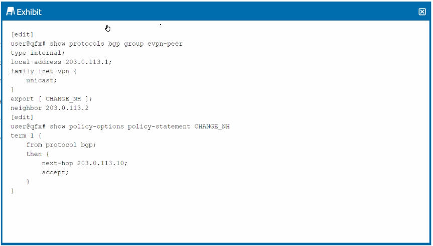 The policy CHANGE_NH is correctly configured to change the next hop to 203.0.113.10 for the matching routes. However, the next hop remains unchanged when advertising EVPN routes to the peer 203.0.113.2.