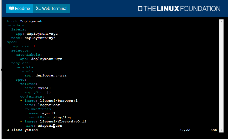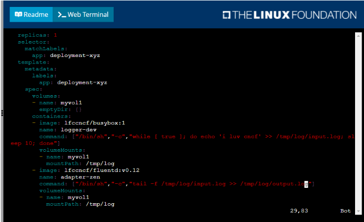 * The adapter-zen sidecar container should read /tmp/log/input.log and output the data to /tmp/log/output.* in Fluentd JSON format. Note that no knowledge of Fluentd is required to complete this task: all you will need to achieve this is to create the ConfigMap from the spec file provided at /opt/KDMC00102/fluentd-configma p.yaml , and mount that ConfigMap to /fluentd/etc in the adapter-zen sidecar container