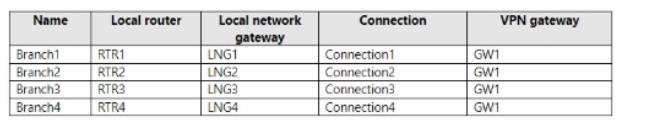 Your company has four branch offices and an Azure Subscription. The subscription contains an Azure VPN gateway named GW1.