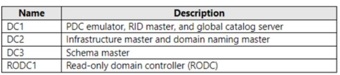 Your network contains an Active Directory Domain Services (AD DS) domain. The domain contains the domain controllers shown in the following table.