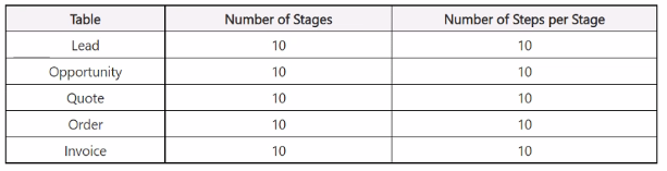 In Dynamics 365, business process flows are limited to 30 stages across all entities within a single process. Since each entity here (Lead, Opportunity, Quote, Order, Invoice) has 10 stages, the total would be 50 stages, exceeding the limit.