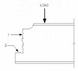 Location 1 on the top edge shows shear failure --- characterized by jagged cracks or fractures, typically near supports or where shear forces peak.