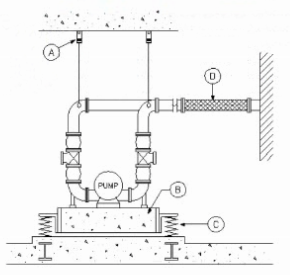 C --- Spring vibration isolators under the pump base to prevent vibration transmission into the building structure.