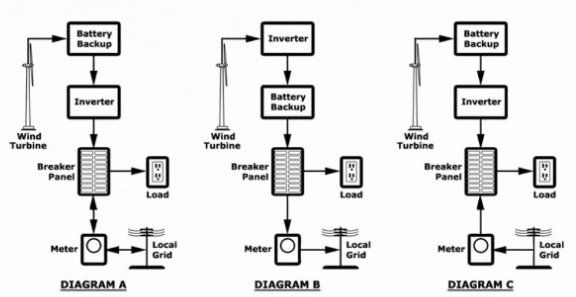 An architect is developing an electrical diagram to show equipment configuration and flow of electricity for a residential project. The project is integrating on-site wind generation where the utility company does not allow net metering.
