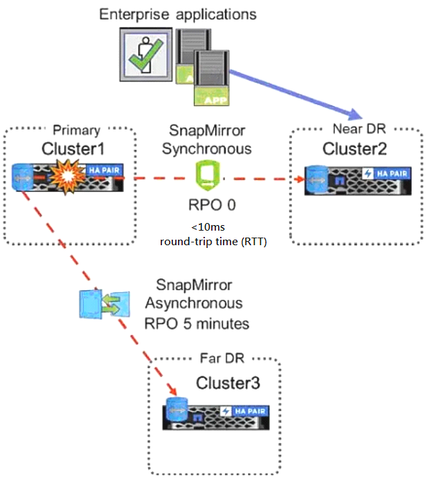 Which two configurations would be used to protect volumes in a production ONTAP system at two different disaster recovery (DR) locations? (Choose two.)