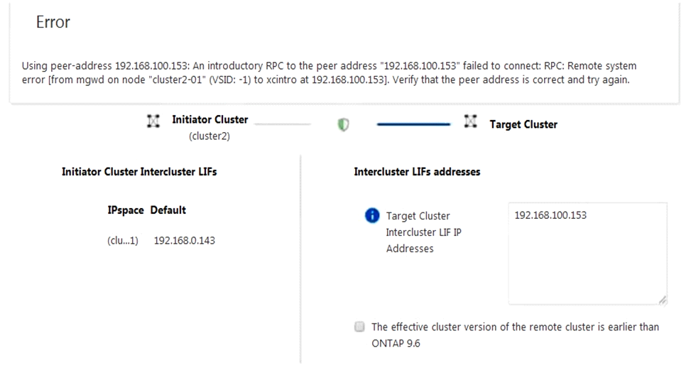 You are configuring cluster peering from cluster2 to cluster1 on your ONTAP 9.7 clusters using ONTAP System Manager. You are given the details shown below to set up the cluster peer relationship. You want to determine why the peering has failed.