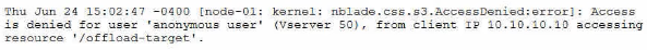 The error message indicates that the access is denied for user 'anonymous user' (Vserver 50), from client IP 10.10.10.10 accessing resource '/offload-target'. This means that the application is not providing a valid user name or access key to authenticate with the ONTAP S3 server.According to the NetApp documentation1, ONTAP S3 server supports both v2 and v4 signatures, but v2 signatures are deprecated and not recommended. Therefore, the application should use v4 signatures to access the ONTAP S3 bucket.Additionally, the application should specify the bucket name in the host name, not in the resource path, as shown in the following example2: