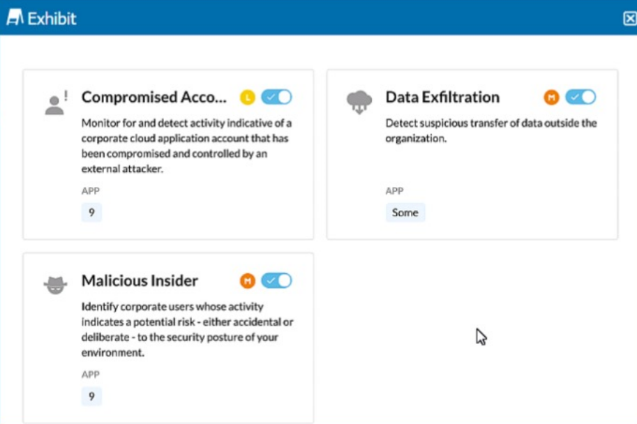 The exhibit showing rules related to compromised accounts, data exfiltration, and malicious insiders aligns with the capabilities provided by Behavior Analytics.