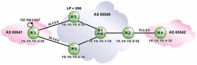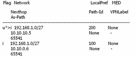 Router R1 is a route reflector with clients R2, R5 and R6. Prefixes advertised by router R5 have a local preference of 200. Router R3 advertises the prefix 192.168.1.0/27 to routers R5 and R6. Assuming that router R6 is configured with "advertise-external", what is the expected output of "show router bgp routes" when executed on router R5?