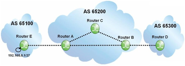Assuming that none of the routers within AS 65200 is configured with next-hop-self", what will the BGP update for the 192.168.0.1/27 prefix contain when it arrives at router B?