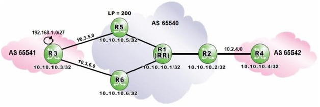 Router R1 is a route reflector with clients R2, R5 and R6. Prefixes advertised by router R5 have a local preference of 200. Router R3 advertises the prefix 192.168.1.0/27 to routers R5 and R6.