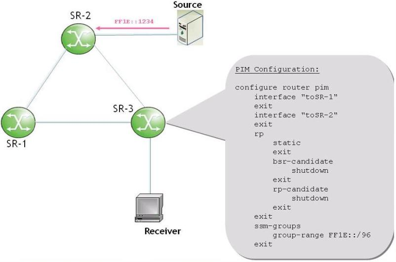 According to the PIM configuration on SR-3, can the receiver in the diagram receive multicast traffic from the source for group FF1E::1234? Assume all the other configurations are correct.