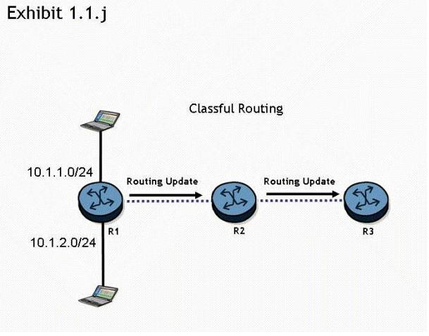 Routers R1 R2, and R3 are running a classful routing protocol between them. Assuming that router R1 advertises all directly connected networks, how will these networks be represented in router R3's routing table?