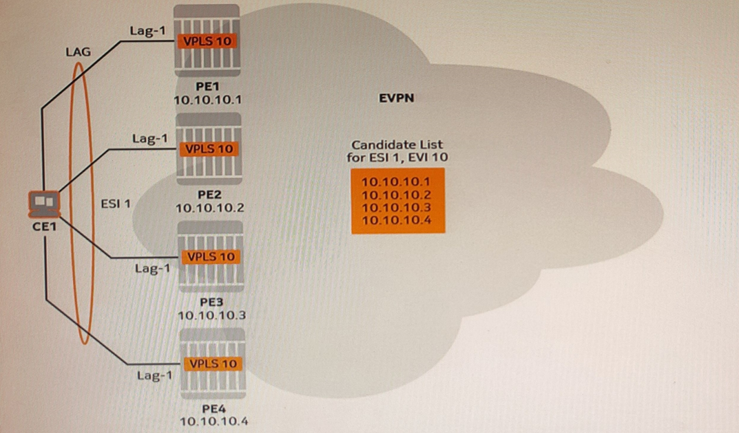 In the exhibit, the default algorithm is used to elect the designated forwarder (DF) on ESI 1. Which PE is elected as DF for VPLS 10?