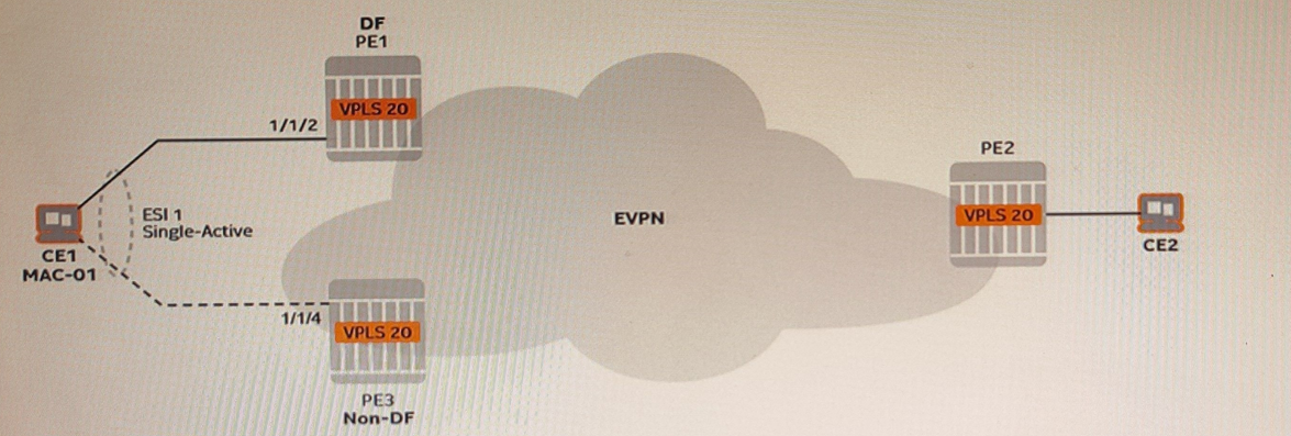 VPLS 20 is associated with a single-active Ethernet segment on routers PEI and PE3. Which of the following statements is FALSE?