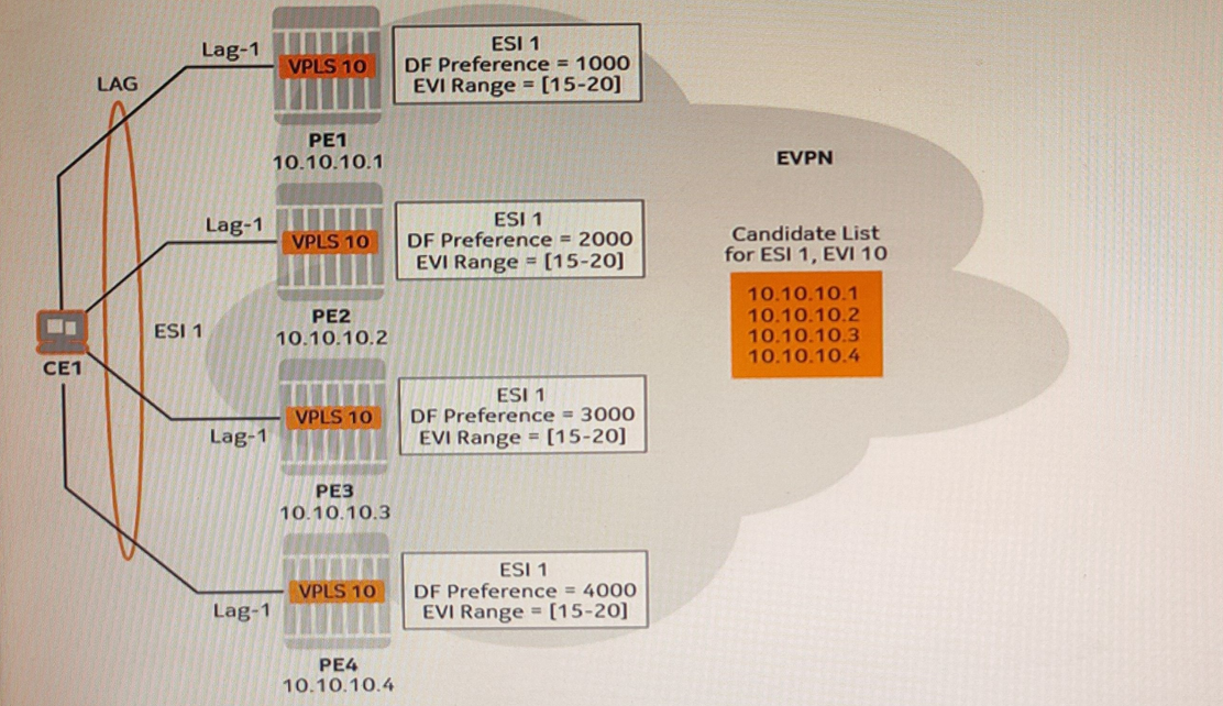 In the exhibit, an EVI range is configured and the preference-based algorithm is used to elect the designated forwarder (DF) on ESI 1. Which PE is elected as DF for VPLS 10?