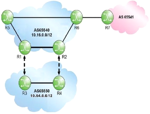 AS 65550 owns CIDR block 10.64.0.0/12. Router R6 advertises the aggregate 10.64.0.0/12 to AS 65541 with "as-set" enabled. Which of the following is TRUE regarding the aggregate route received by router R7?