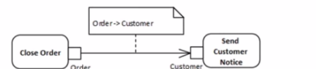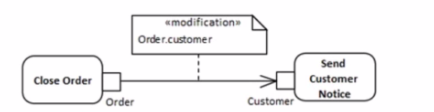 The correct answer is C, which uses a transformation edge to indicate that when an order is closed, information is transformed or processed to notify the customer. This is expressed in UML with an object flow that has a transformation property, which specifies how an object is transformed from one state to another as it flows along the edge. This is appropriate for a scenario where closing an order leads to the creation of a customer notice, implying some form of transformation or processing of the order information to generate the notice.