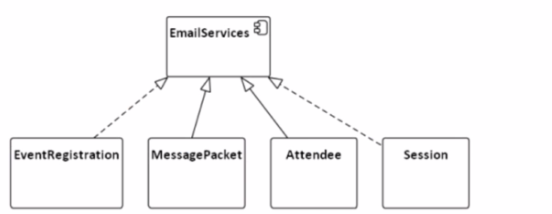 The provided diagram fragment shows what appears to be Components or Classes with dashed arrows pointing towards them. Typically in UML, a dashed arrow with an unfilled arrowhead represents a Realization relationship, which is used to show that an element (such as an interface) is realized by another element (such as a class or component). However, when we are talking about Classes like 'EventRegistration,' 'MessagePacket,' 'Attendee,' and 'Session' which seem to share a common nature or purpose with 'EmailServices,' these relationships are more appropriately modeled as Generalizations, indicating that they inherit from a common superclass or implement a common interface. Realizations are typically not used in this context. Hence, the dashed arrows in the diagram should be solid lines representing Generalization, not Realization. This answer aligns with the UML 2.x Superstructure Specification, which provides guidance on the usage of Realization and Generalization relationships in class diagrams.