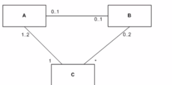 Multiplicity between B and C is '0..2', which means that for each instance of B there are zero, one, or two links to instances of C.