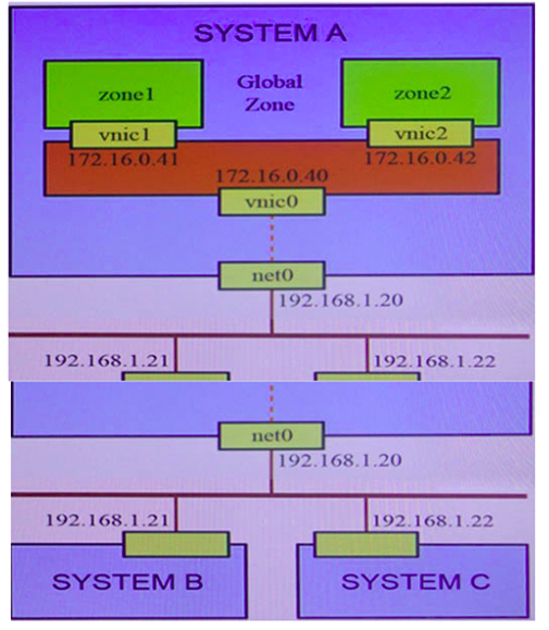 However, logged in to the global zone of SystemA, you can successfully ping 172.16 0.41 and 172.16.0.42, as well as 192.168.1.21 and 192.168.1.22.
