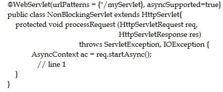 What should you do at line 1 to enable this servlet receive request data without blocking?