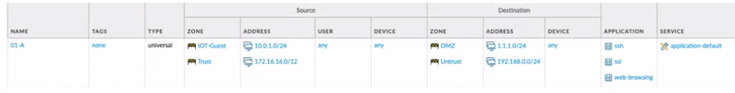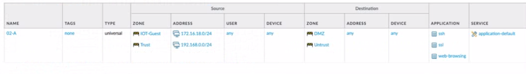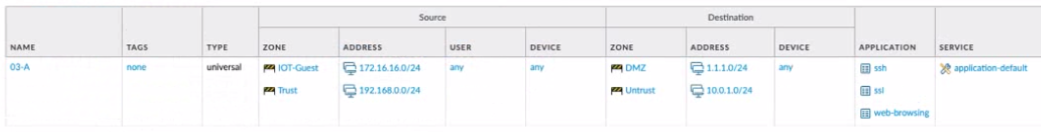 View the diagram. What is the most restrictive, yet fully functional rule, to allow general Internet and SSH traffic into both the DMZ and Untrust/lnternet zones from each of the lOT/Guest and Trust Zones?