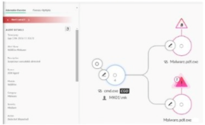 A (Incorrect): While Malware.pdf.exe is shown as responsible for generating the alerts, the entire chain starts from cmd.exe, not Malware.pdf.exe.