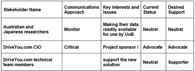After the business case is approved and a project is initiated, the project manager needs to create a stakeholder communication plan to implement the change. Here is an extract from the plan: