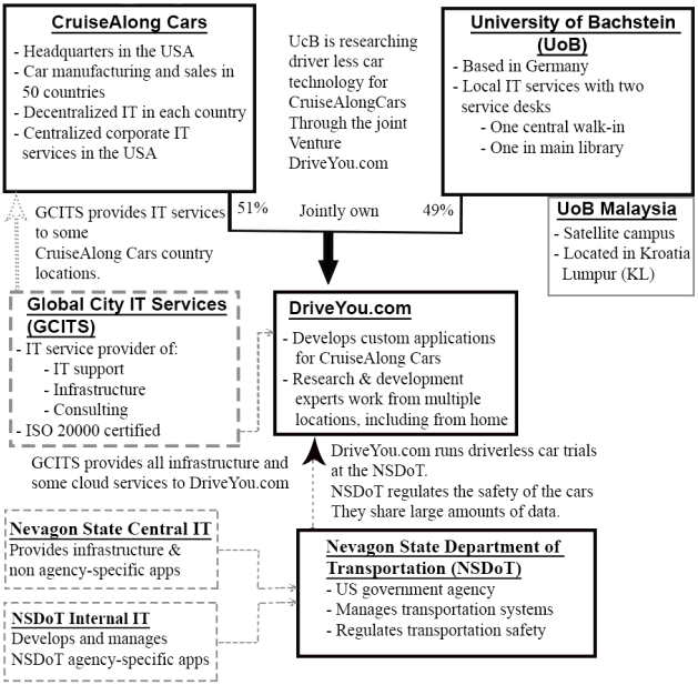 CruiseAlong Cars is a car manufacturing and sales company with corporate headquarters in the United States of America. It has grown by acquisition over the last 20 years and has operations in over 50 countries.Each country has its own IT organization, with some central corporate IT services provided by the US parent company. In some countries CruiseAlong Cars has outsourced infrastructure and service desks. The largest IT supplier is Global City IT Services (GCITS). In two countries GCITS provides CruiseAlong Cars with full outsourced services. They also provide selected services in other countries.