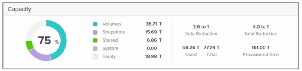 D . Total deduplicated space: Pure Storage combines dedupe, compression, and pattern removal into a single 'data reduction' metric. Deduplication alone is not isolated in capacity reporting.