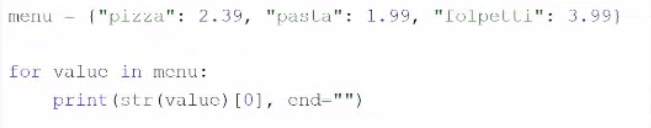 pizza = ''pizza'' pasta = ''pasta'' folpetti = ''folpetti'' print(pizza[0] + pasta[0] + folpetti[0])
