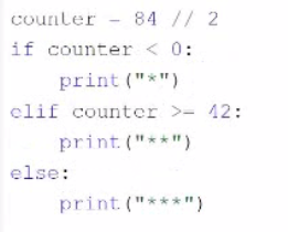 The expected output of the code depends on the value of ''counter''. If the value of ''counter'' is 10, as shown in the image, the code will print two asterisks (**) to the screen, because 10 is neither less than 0 nor greater than or equal to 42. Therefore, the correct answer is C. * *
