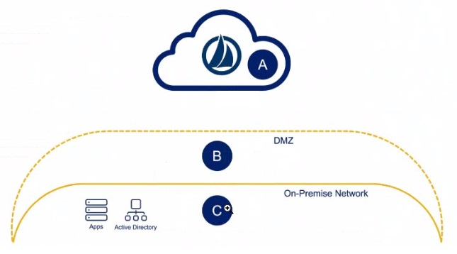 Yes, the Virtual Appliances (VAs) should reside in C, which represents the on-premise network. In this scenario, the engineer has an Active Directory, a database server, and cloud applications. The VA needs to reside inside the internal on-premises network (C) to securely communicate with the Active Directory and database server. The VA will manage the secure connection to these internal resources and can also interact with cloud applications via SailPoint IdentityNow.