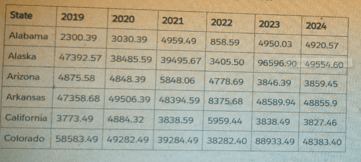 Separate columns for each year: 2019, 2020, 2021, 2022, 2023, 2024