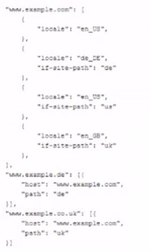 In the provided configuration, the incorrect statement is B. While it appears that the hostname www.example.com should redirect to www.example.com/us based on the 'if-site-path': 'us' entry, this assumes that the default path or redirect isn't overridden by other configurations within the hostname alias file not visible in the snapshot provided. Typically, in Salesforce B2C Commerce, such a direct statement about redirection should align with explicit mapping rules that include hostname and path directives, which are not detailed for www.example.com to www.example.com/us in the snippet provided. This absence suggests that the statement may be incorrect unless corroborated by additional detailed mappings in the full configuration file.